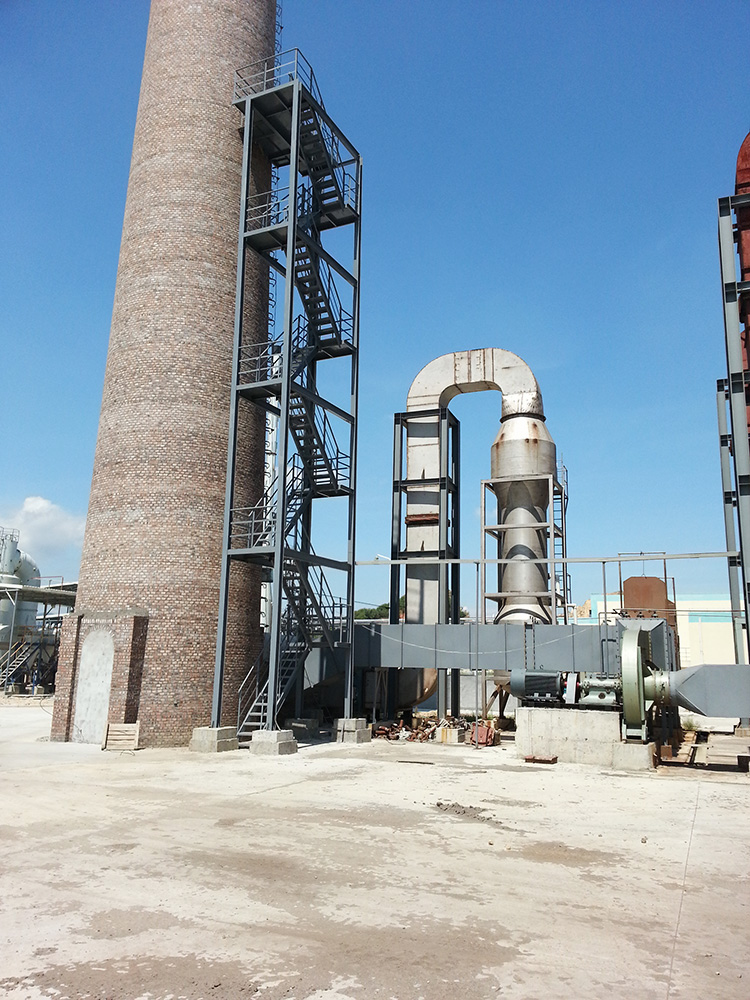 不銹鋼脫硫塔、干式導流管除塵器及自動加藥設備。
